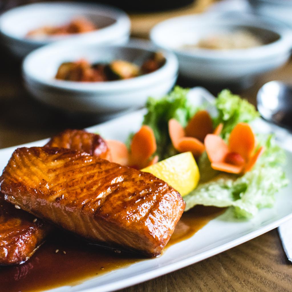 Обои Два куска рыбы в соусе с овощами на тарелке