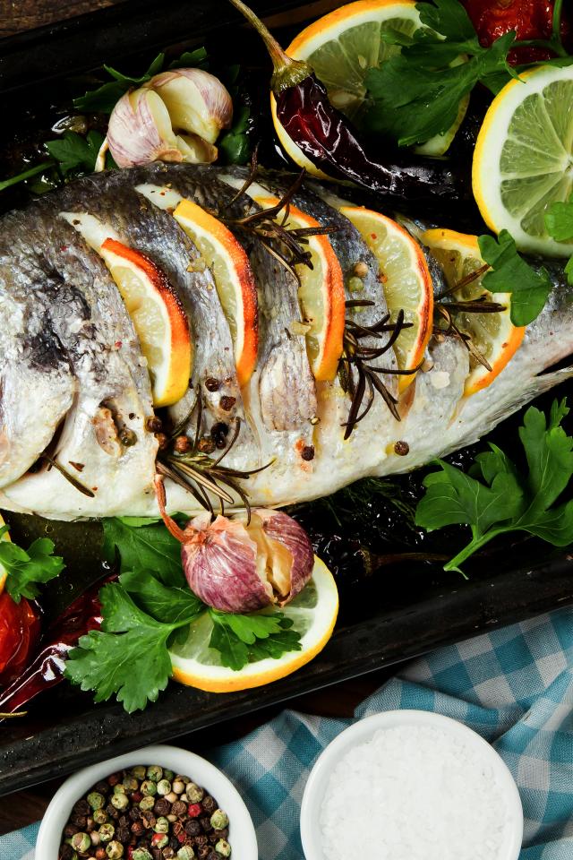 Обои Запеченный карась с помидорами и лимоном