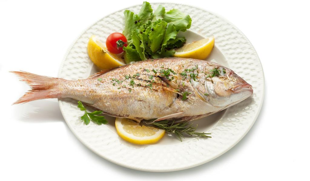 Обои Запеченная рыба на тарелке с зеленью и лимоном