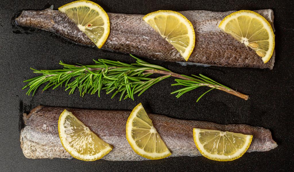 Обои Свежее филе рыбы с лимоном и розмарином на черном фоне