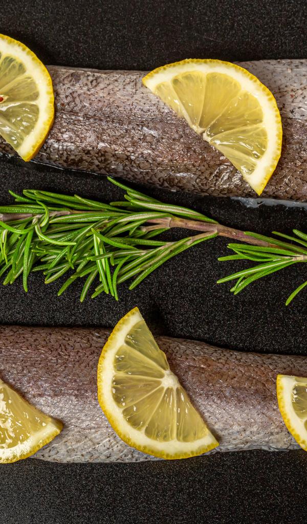 Обои Свежее филе рыбы с лимоном и розмарином на черном фоне
