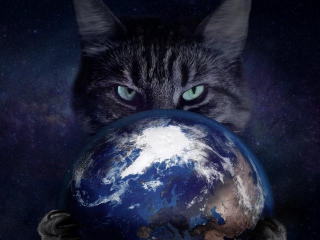 Обои Коварный серый кот с планетой Земля в лапах