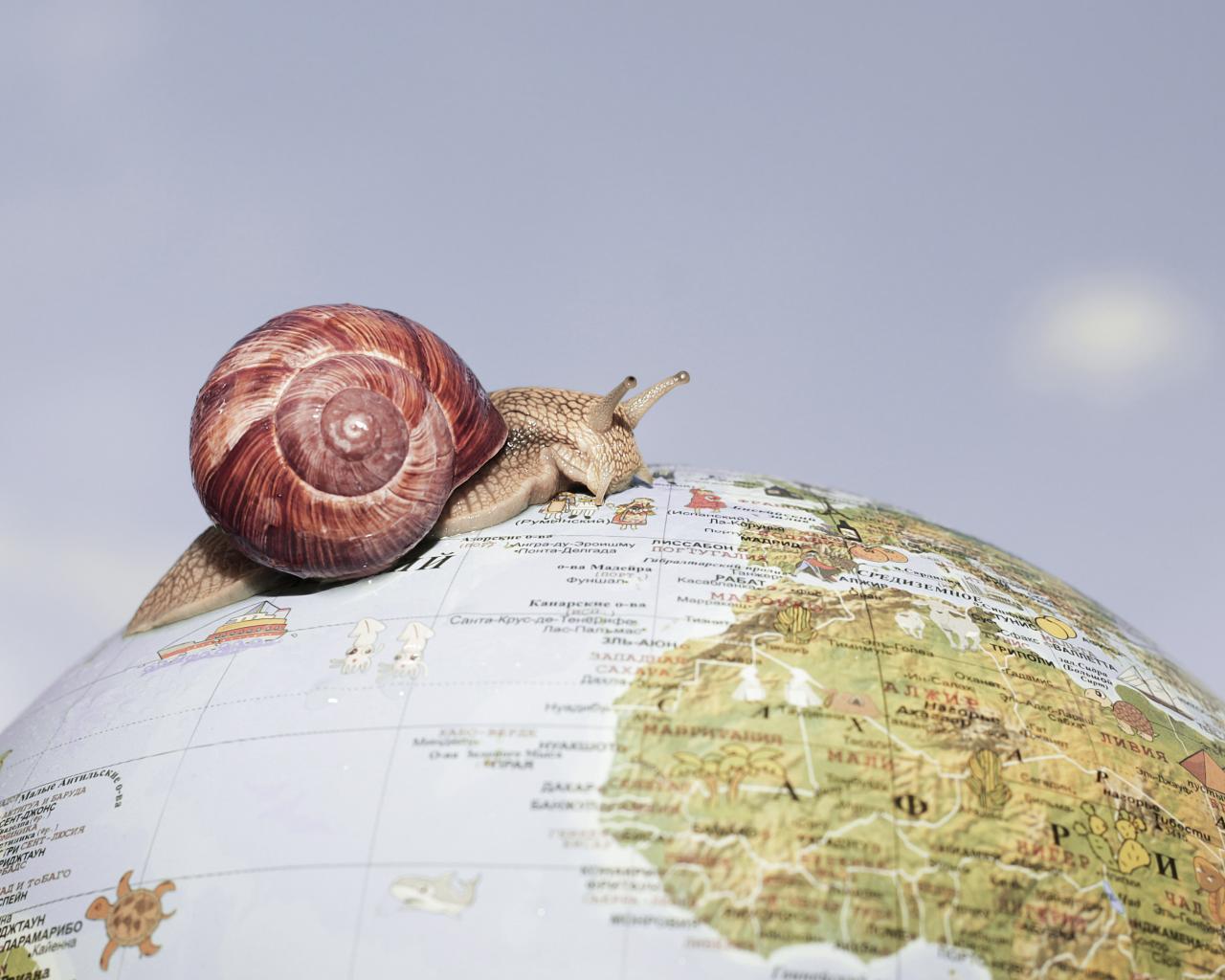 Обои Улитка ползет по глобусу на сером фоне