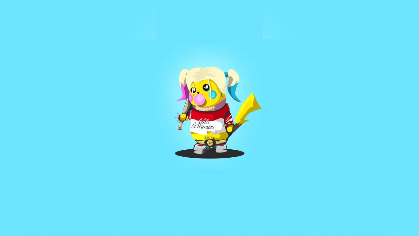 Обои Пикачу в костюме Харли Квинн на голубом фоне