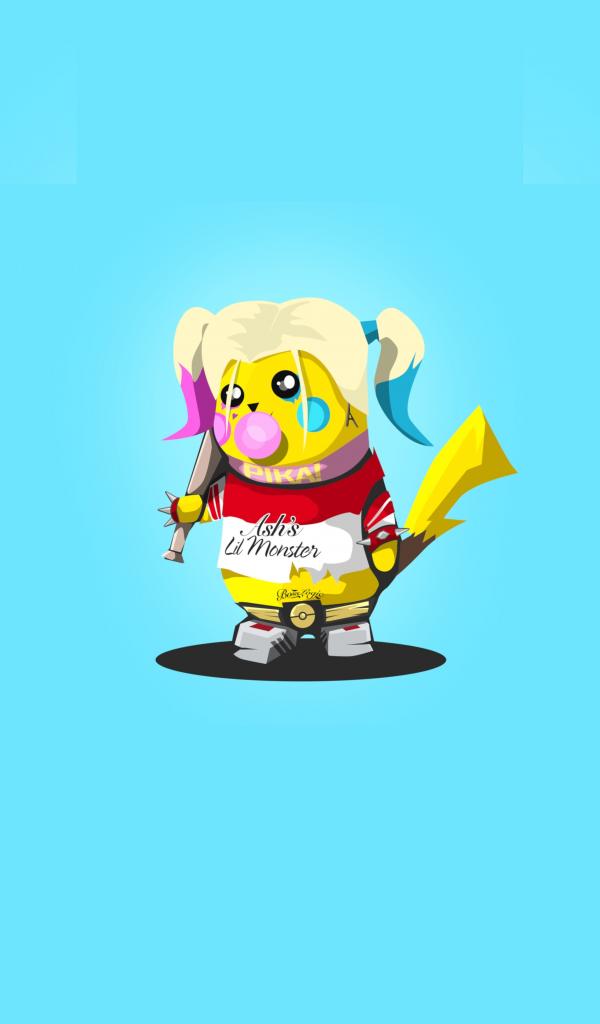 Обои Пикачу в костюме Харли Квинн на голубом фоне
