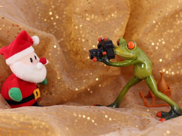 Обои Зеленая жаба фотографирует Деда Мороза