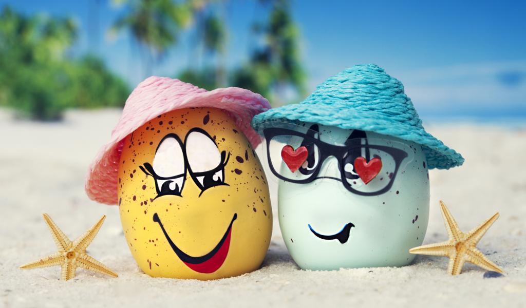 Обои Два яйца в шляпах на песке с морскими звездами летом