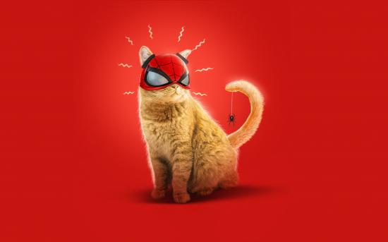 Обои Рыжий кот в маске спайдермена на красном фоне