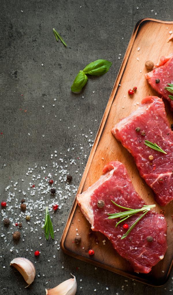 Обои Куски мяса на разделочной доске с зеленью и специями
