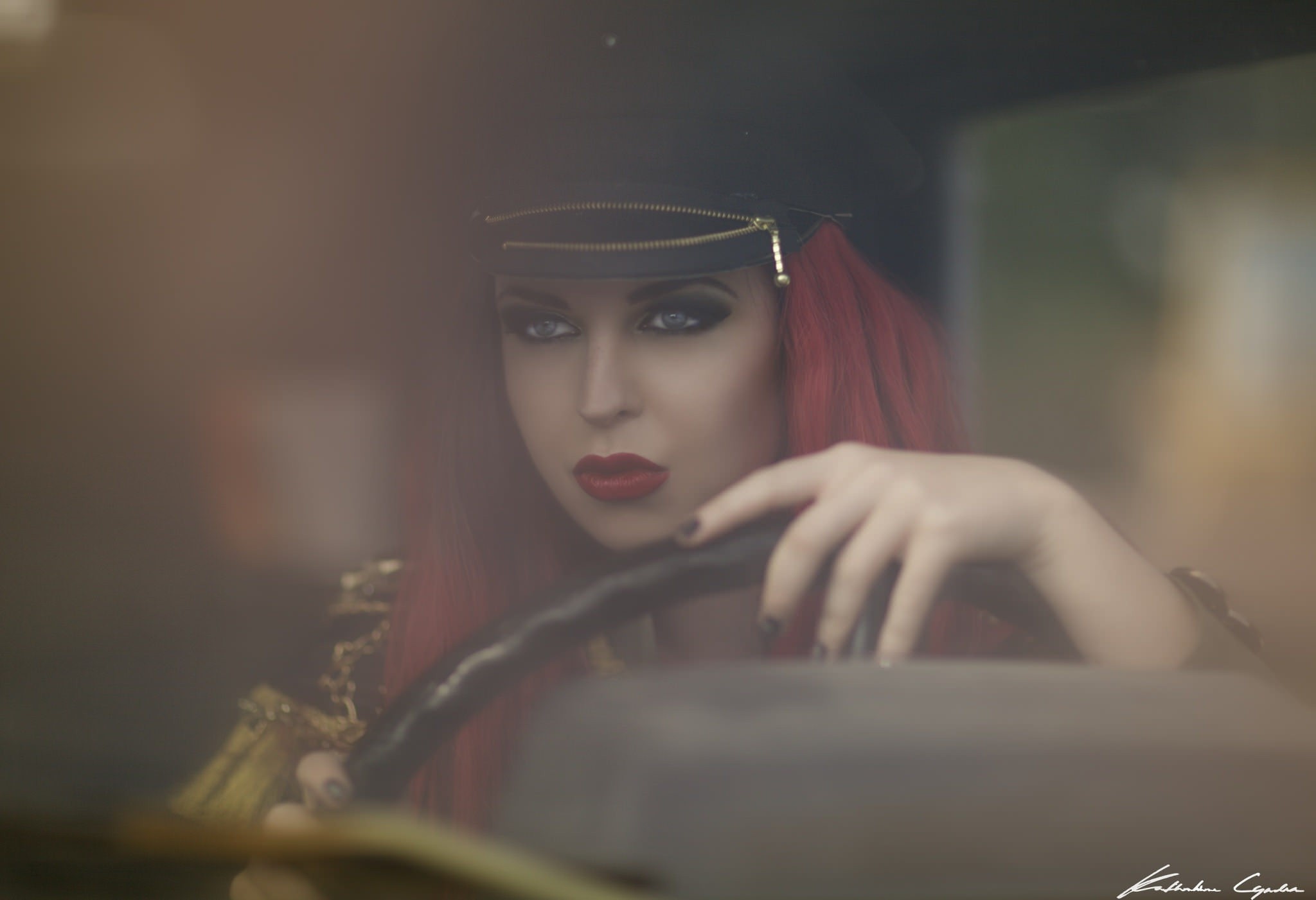 Обои Голубоглазая ретро девушка за рулем автомобиля