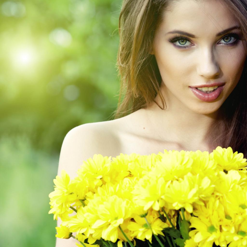 Обои Длинноволосая девушка с букетом желтых полевых цветов