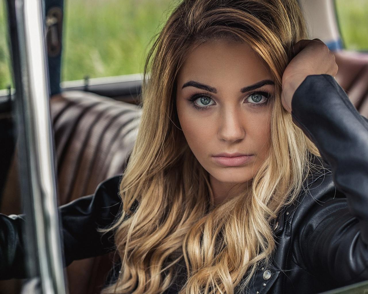Обои Зеленоглазая блондинка в автомобиле