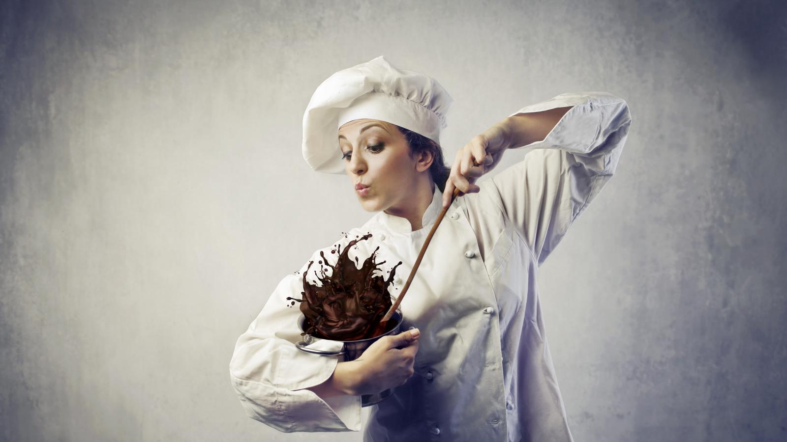 Обои Женщина повар мешает шоколад в посуде на сером фоне