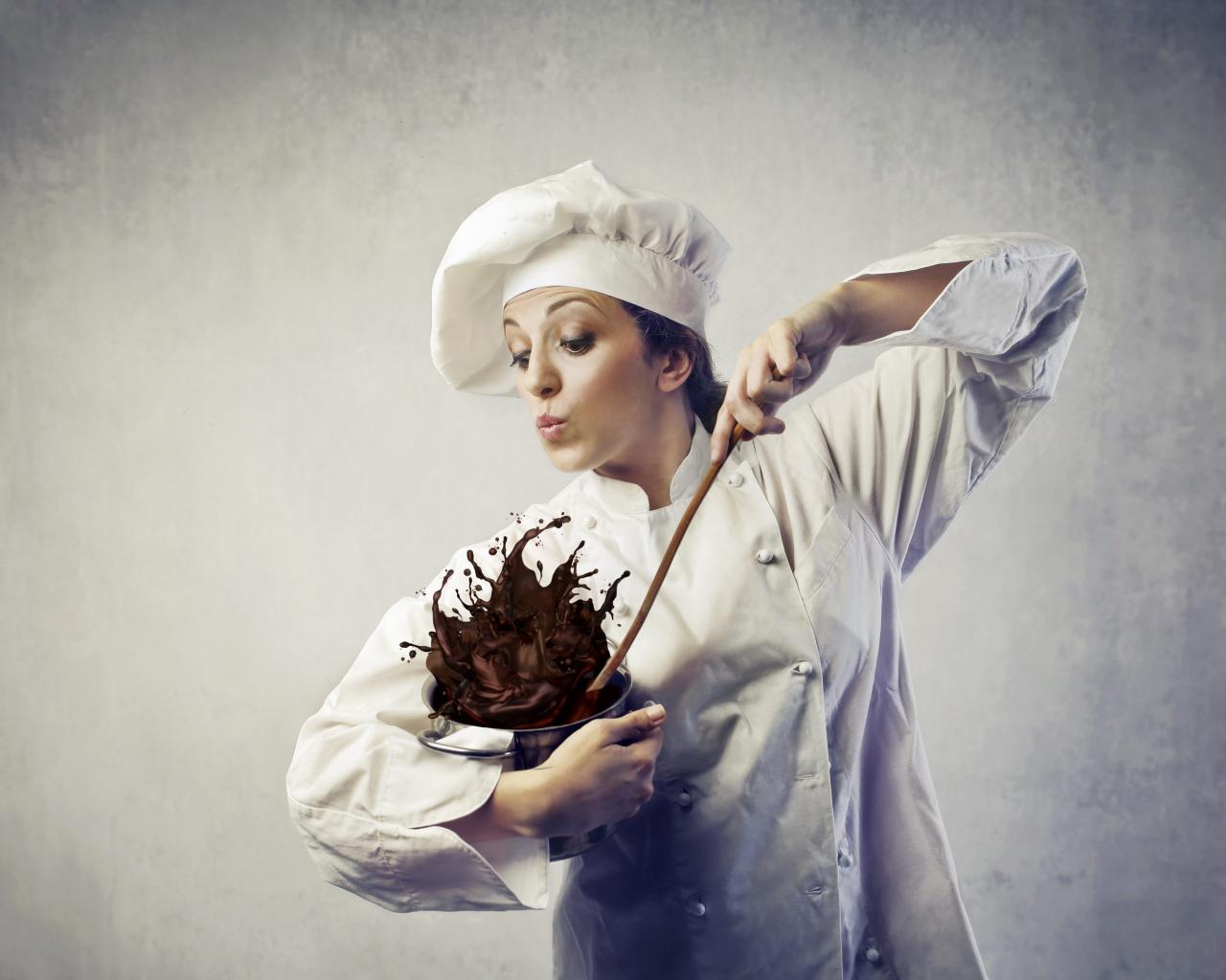 Обои Женщина повар мешает шоколад в посуде на сером фоне