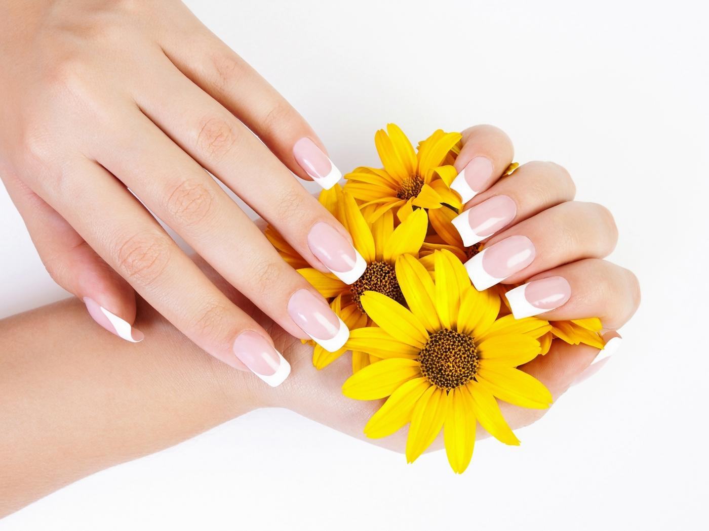 Обои Красивые женские руки с маникюром с желтыми цветами