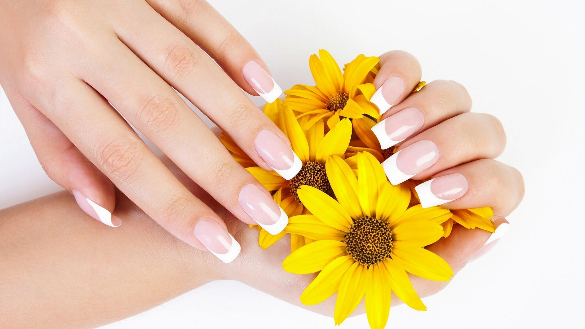 Обои Красивые женские руки с маникюром с желтыми цветами