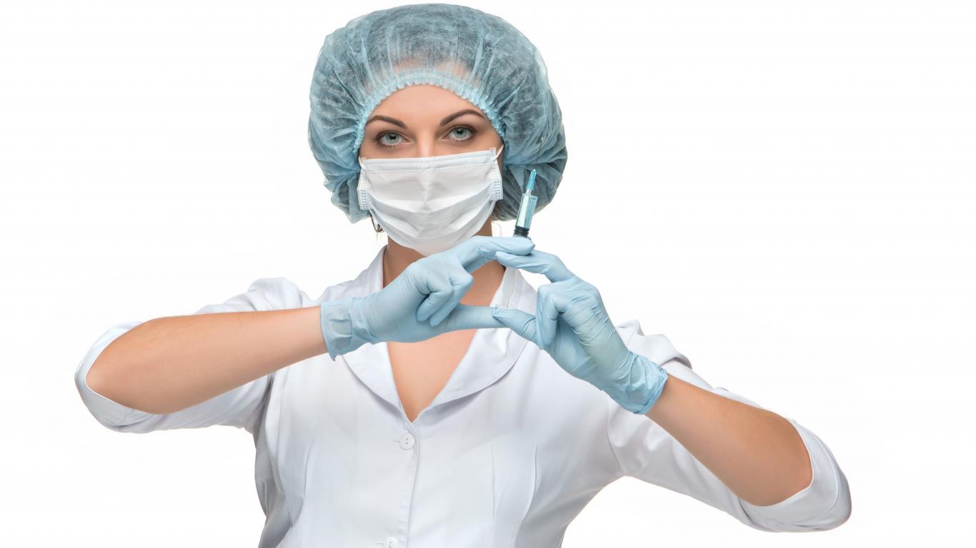 Обои Девушка медсестра в маске со шприцем в руках на белом фоне