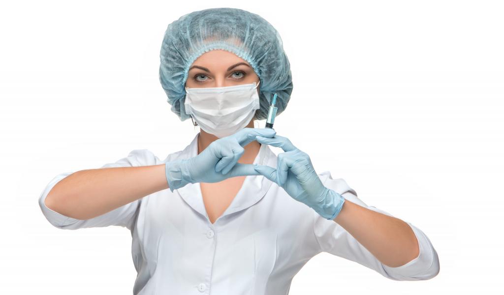 Обои Девушка медсестра в маске со шприцем в руках на белом фоне