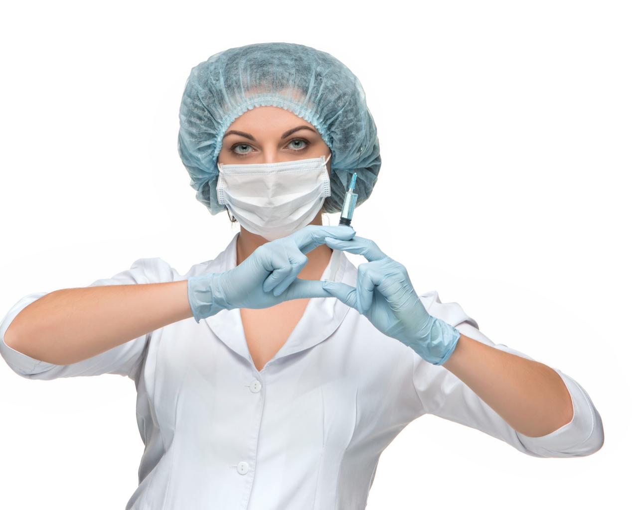 Обои Девушка медсестра в маске со шприцем в руках на белом фоне