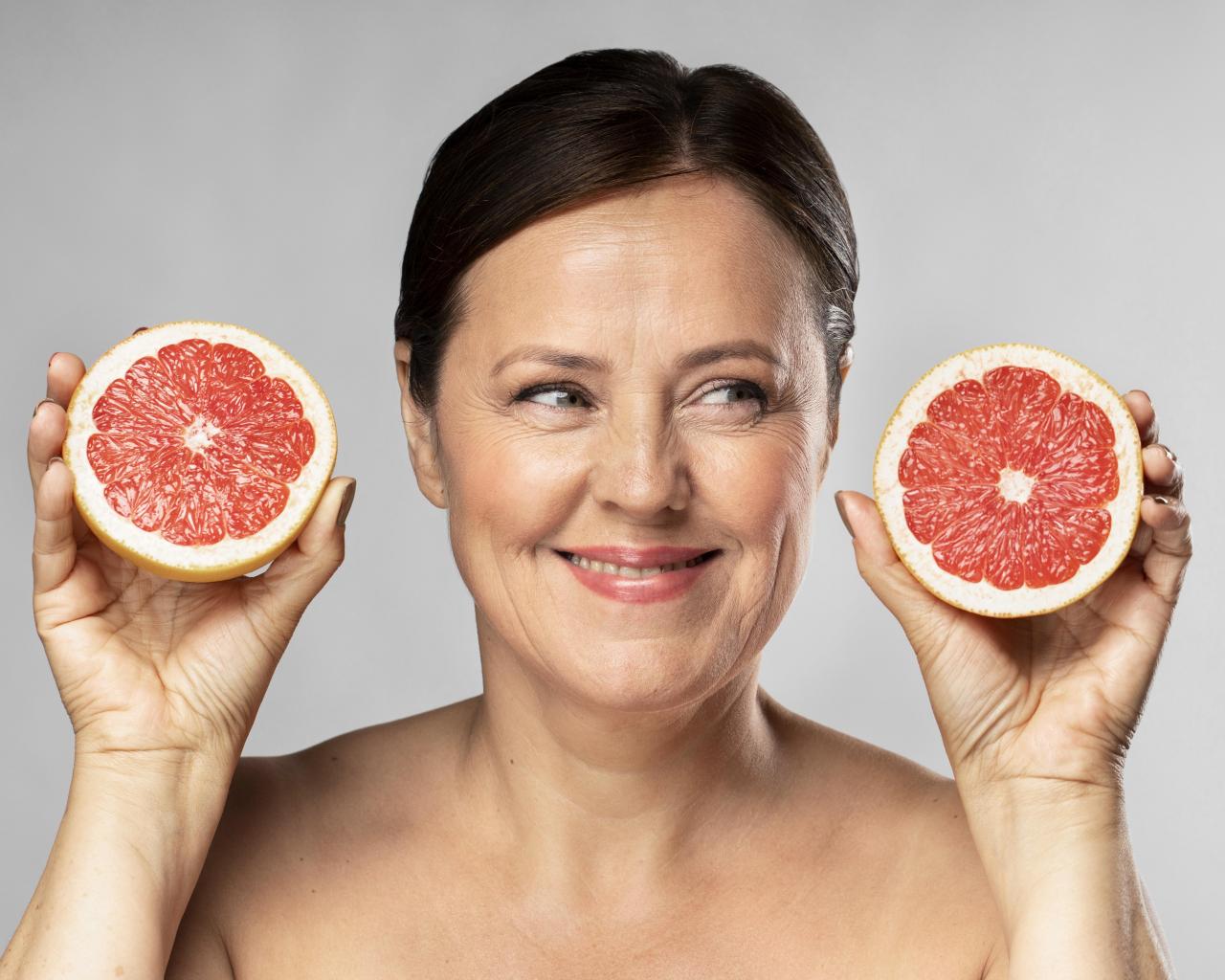 Обои Улыбающаяся женщина с грепфрутом в руках на сером фоне