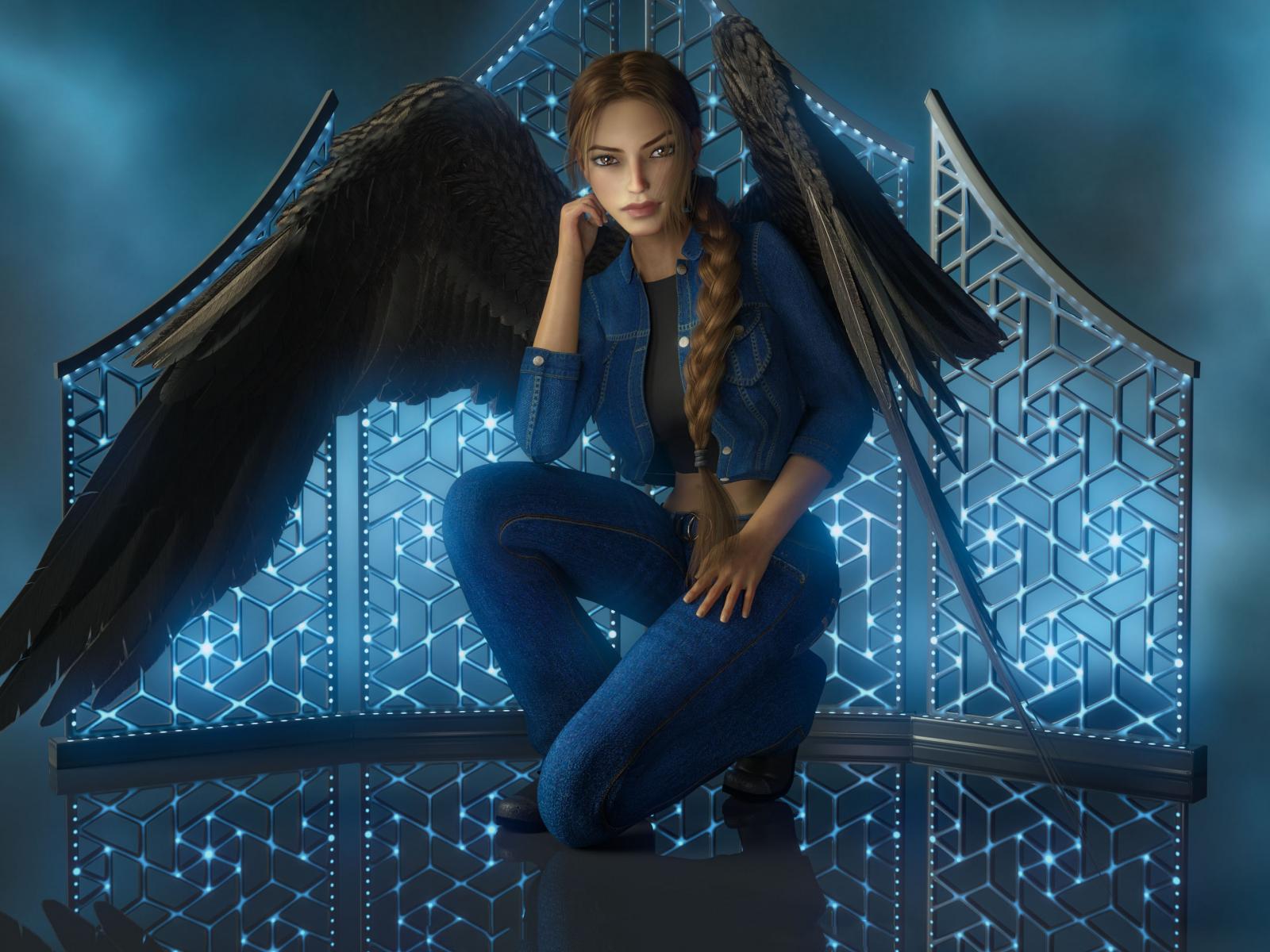 Обои Девушка 3д с большими черными крыльями