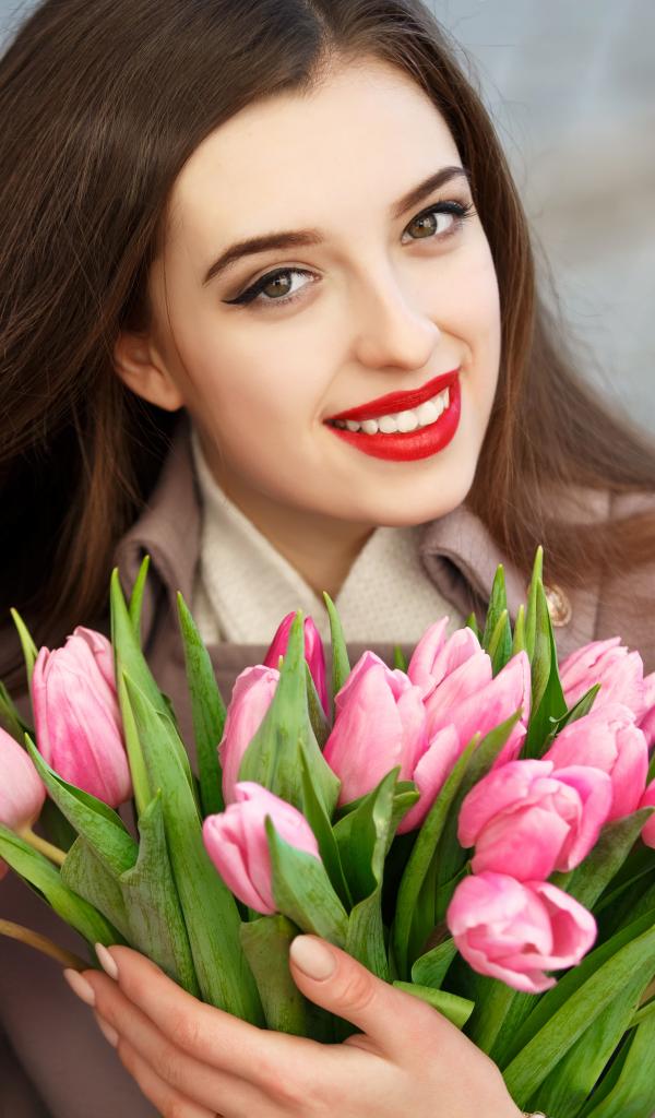 Обои Красивая девушка брюнетка с букетом тюльпанов