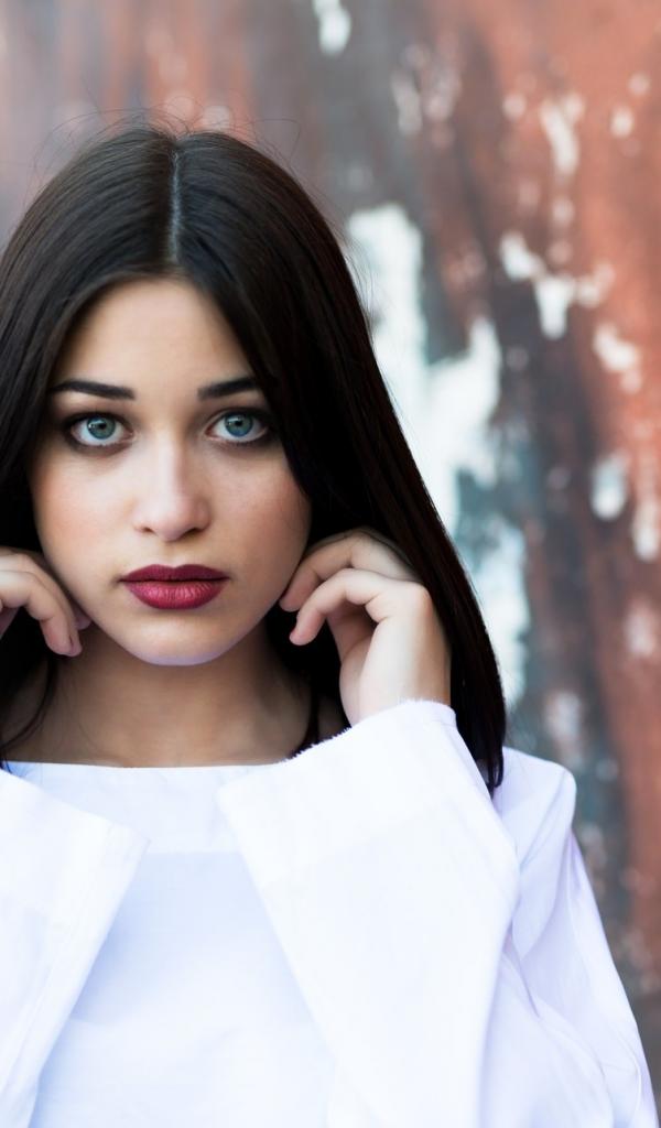 Обои Молодая девушка с бордовыми губами в белом наряде