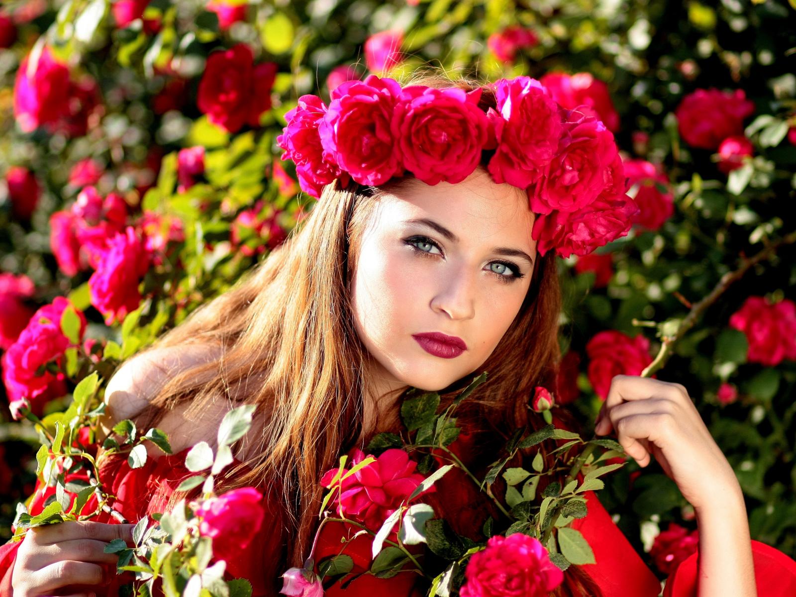Обои Красивая девушка с венком из красных роз на голове