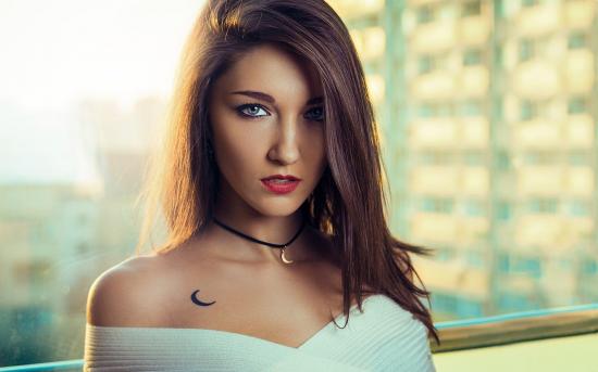 Обои Стильная брюнетка с татуировкой в форме месяца