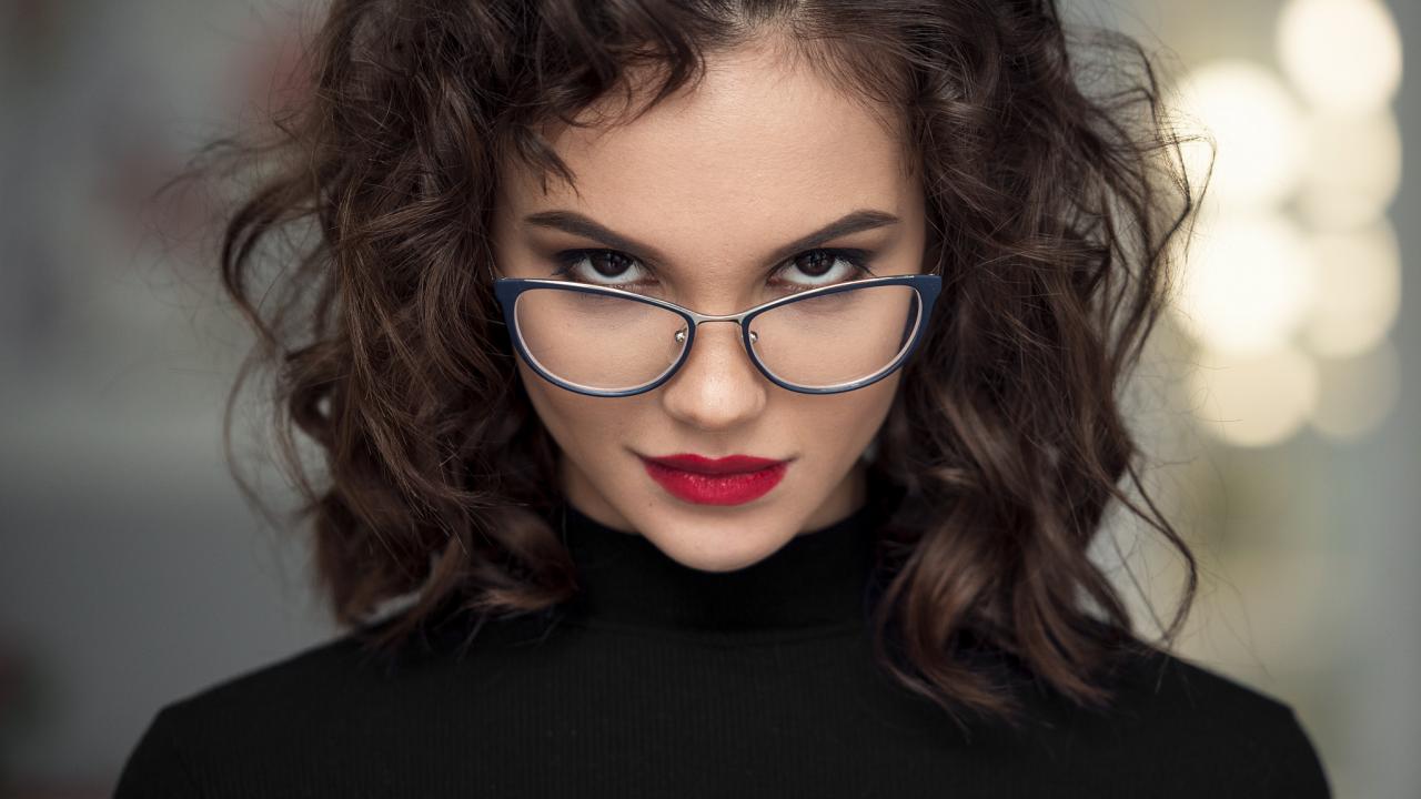Обои Брюнетка с красными губами с очками на лице