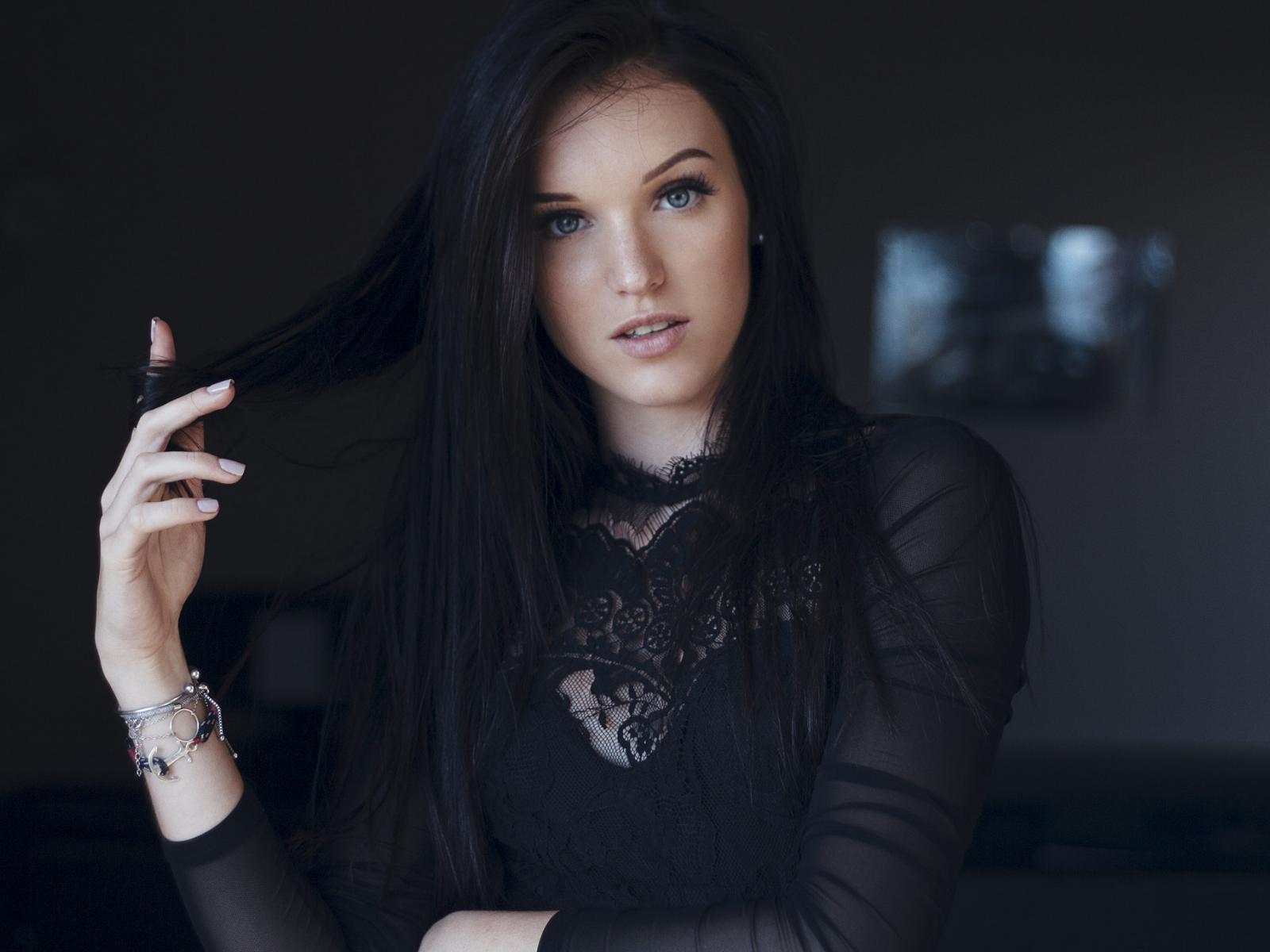 Обои Голубоглазая эффектная брюнетка в черном платье
