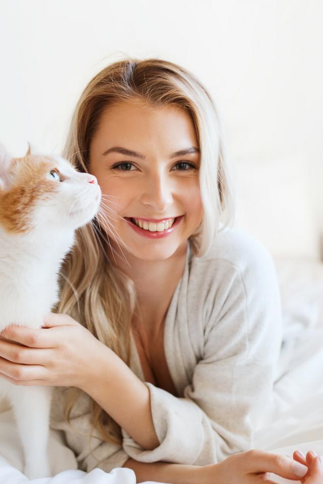 Обои Красивая улыбающаяся девушка с котом лежит на кровати
