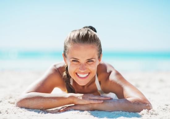 Обои Улыбающаяся девушка лежит на белом песке на пляже