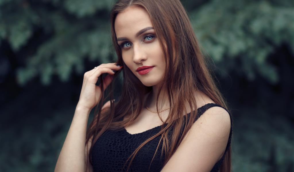 Обои Голубоглазая девушка брюнетка в черном платье