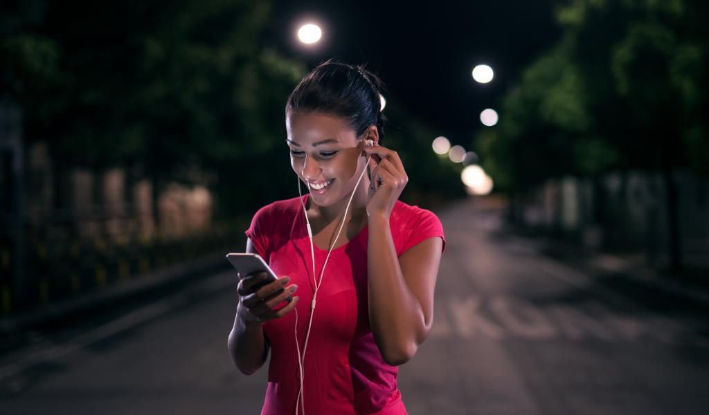 Обои Молодая улыбающаяся девушка в наушниках с телефоном в руках