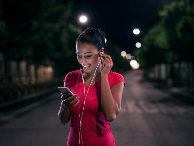 Обои Молодая улыбающаяся девушка в наушниках с телефоном в руках