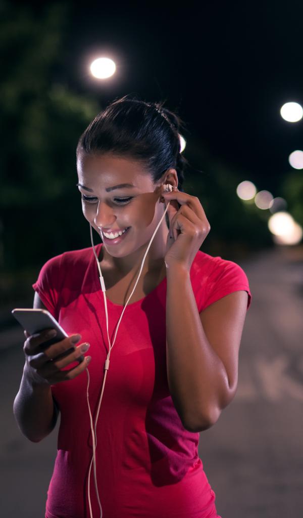 Обои Молодая улыбающаяся девушка в наушниках с телефоном в руках