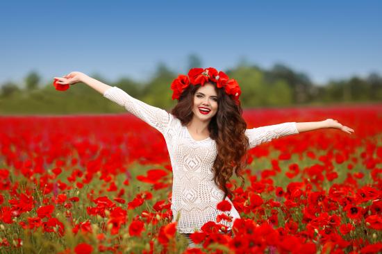 Обои Красивая улыбающаяся девушка в поле с красными маками