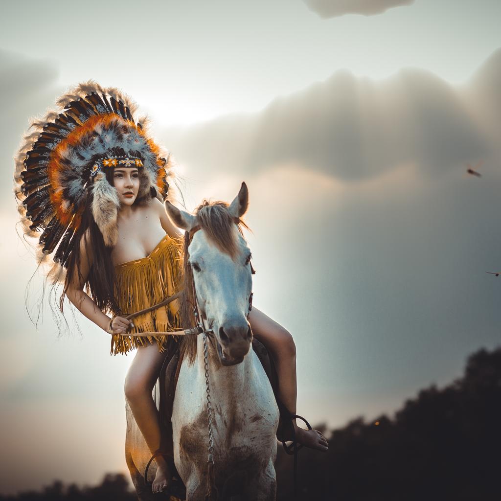 Обои Молодая девушка в костюме индейца на коне