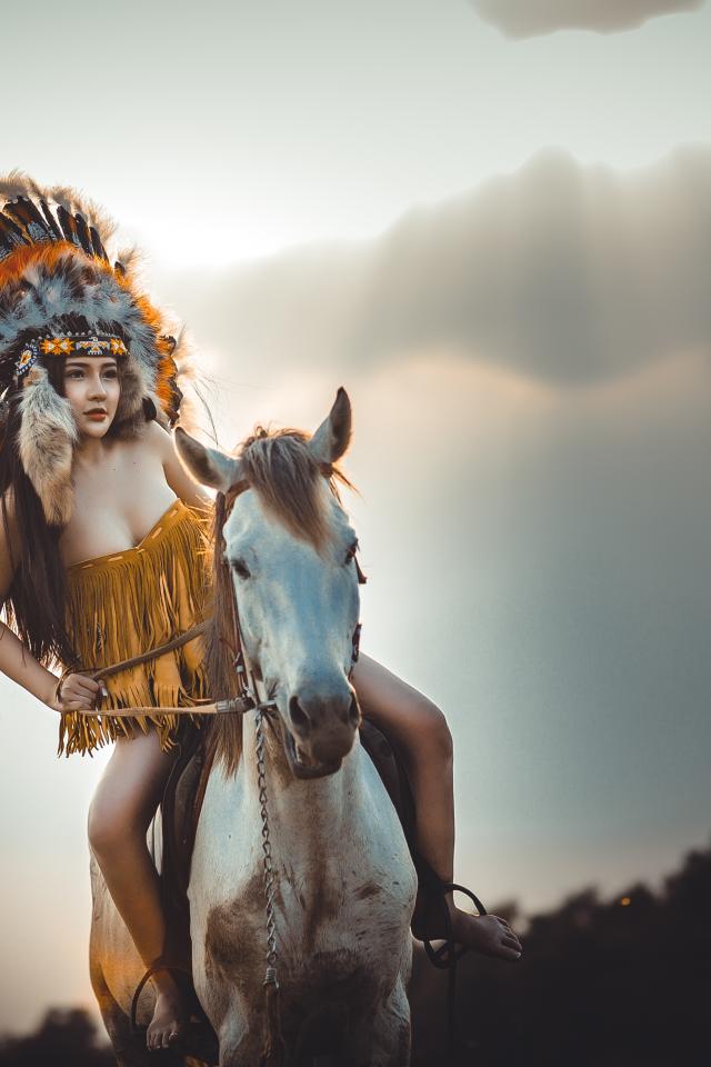 Обои Молодая девушка в костюме индейца на коне