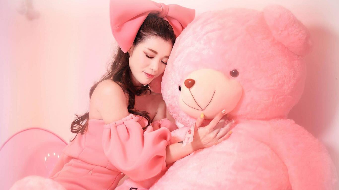 Обои Красивая девушка азиатка с большим розовым медведем