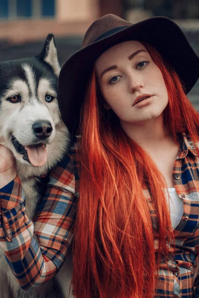 Обои Рыжеволосая девушка в черной шляпе сидит с хаски