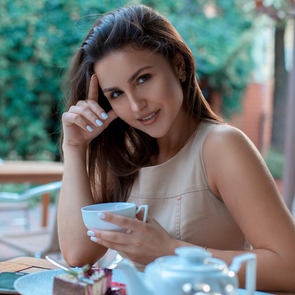Обои Молодая улыбающаяся девушка с чашкой кофе в кафе