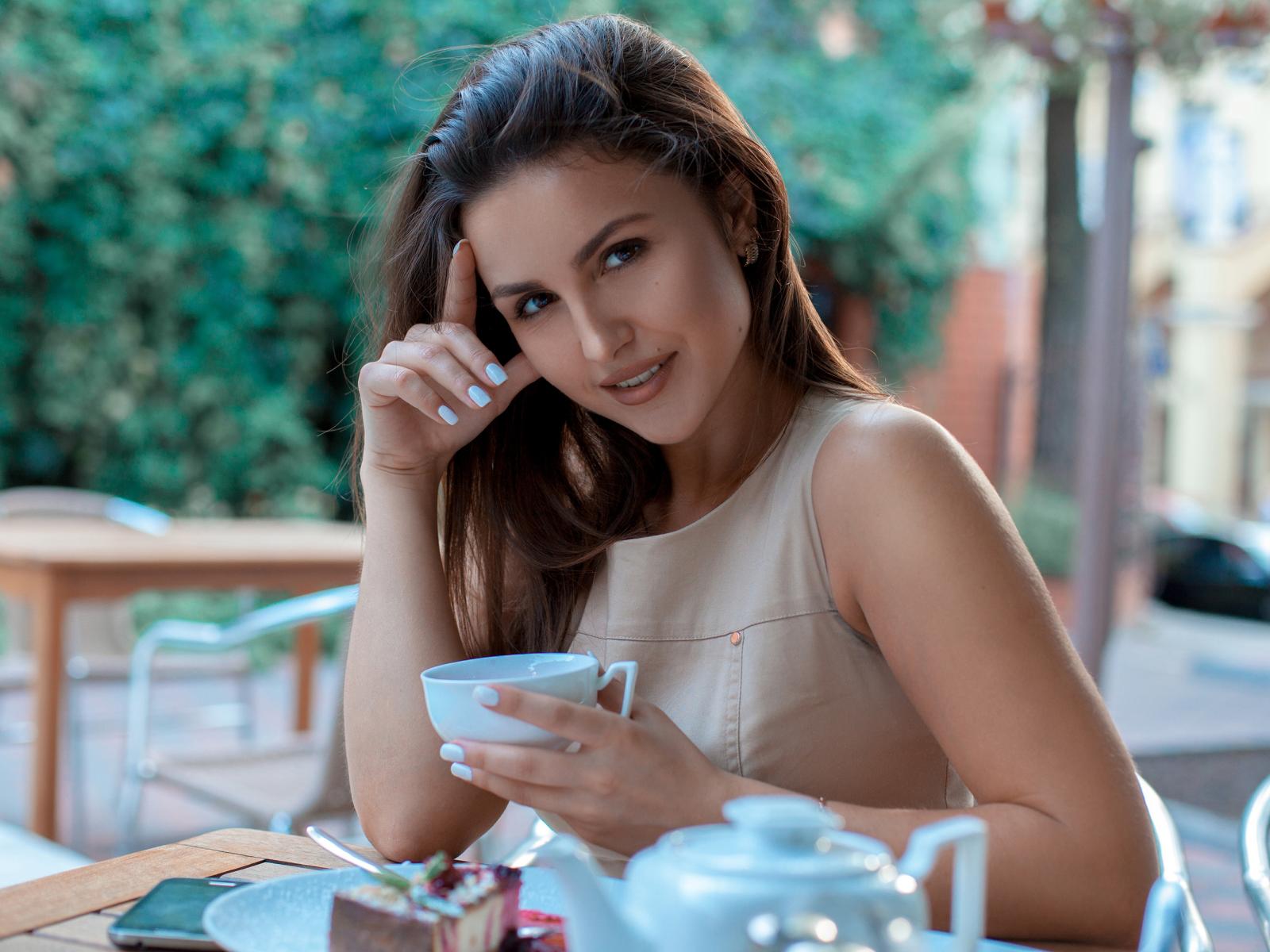 Обои Молодая улыбающаяся девушка с чашкой кофе в кафе