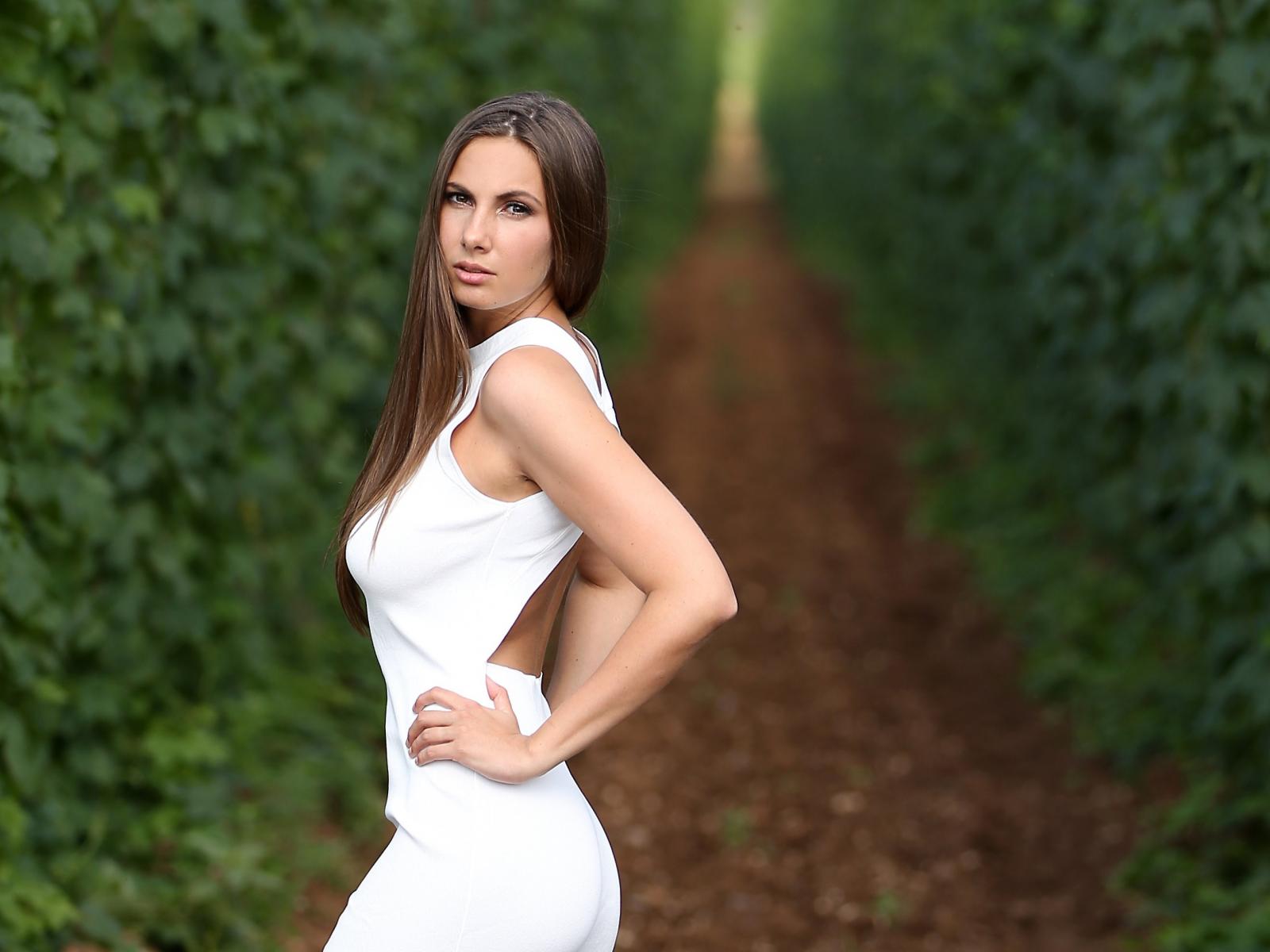 Обои Красивая молодая девушка с длинными волосами в белом платье