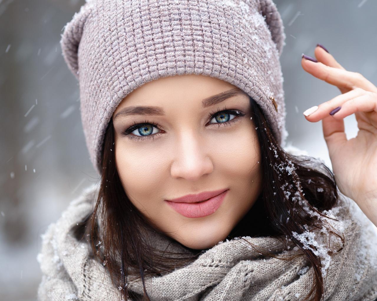 Обои Милая голубоглазая брюнетка в теплой шапке зимой