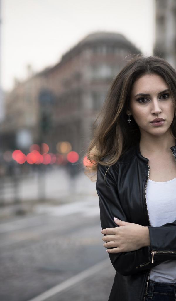 Обои Молодая брюнетка в черной кожаной куртке