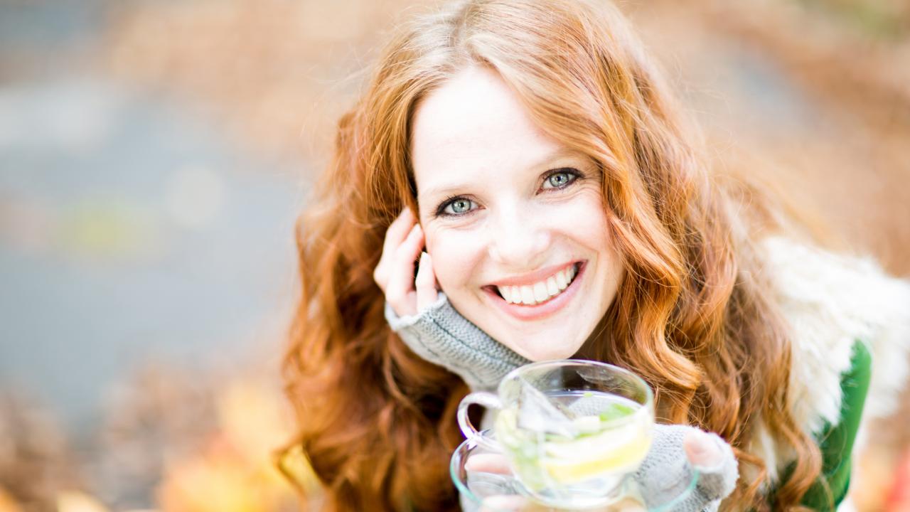 Обои Улыбающаяся рыжеволосая девушка с чашкой чая в руке