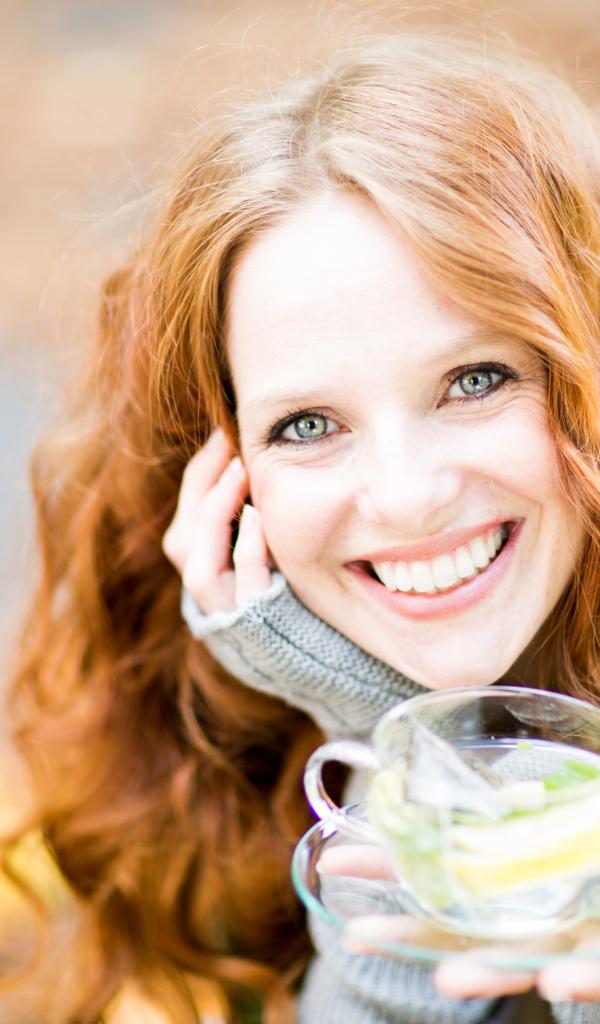 Обои Улыбающаяся рыжеволосая девушка с чашкой чая в руке