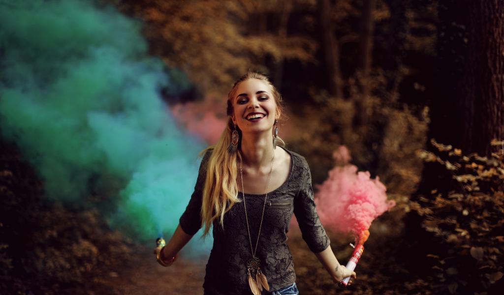 Обои Красивая улыбающаяся девушка с дымовыми шашками в руках